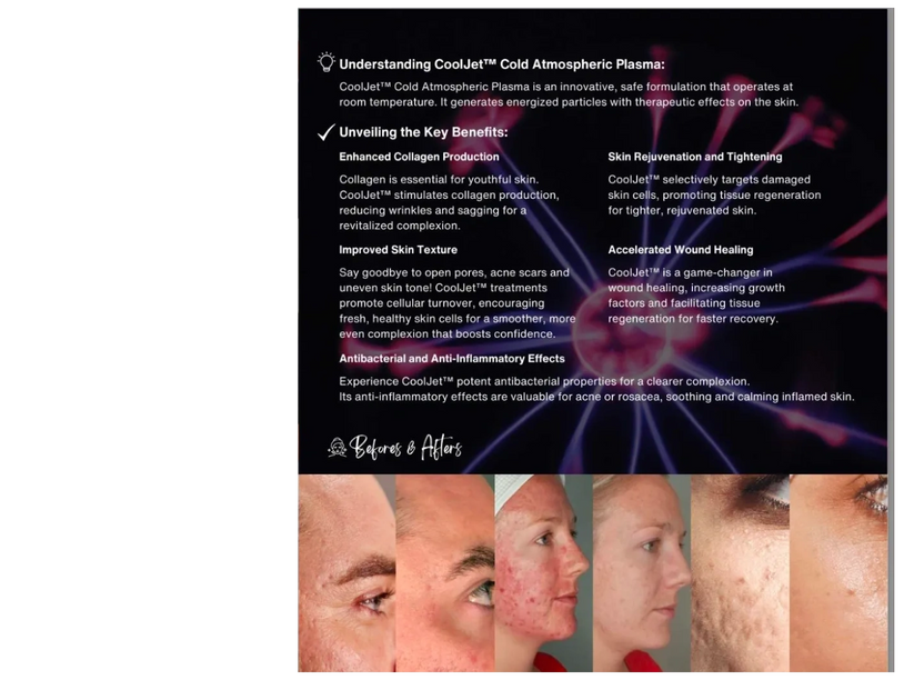 CoolJet will break the bacterial molecules on the surface of the skin, allowing the ozone to sterilize and purify the cell. CoolJet will kill the bacteria and as a result the plasma ozone therapy will destroy the Propionibacterium acnes (P.acnes) CoolJet creates an aerobic state (oxygenated) to combat anaerobic state where the skin is lacking oxygen, making it almost impossible for acne to thrive. After CoolJet treatment the skin will have a 25% reduction in sebum/oil production.